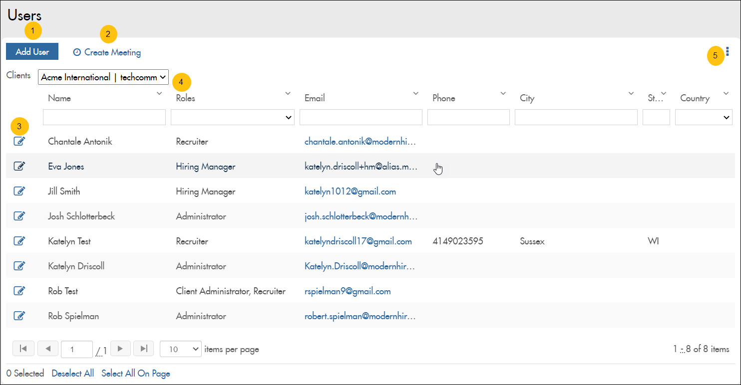 The image below displays the User Management page. Areas where you can perform actions are highlighted and described below.