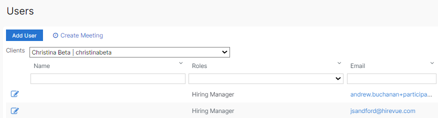 The User Management page displays all available users and provides access to the edit page for each user. Client Administrators can access the User Management page by selecting User Management from the Settings menu within the user menu (your name) in the Hirevue header.
