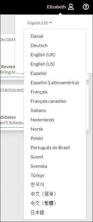 To change the profile language, click the Profile (Name) on the main Hirevue header. The language option that appears is the currently-selected profile language. Click that language to display a drop-down list of supported languages. Select any supported language in the list to change the profile language.