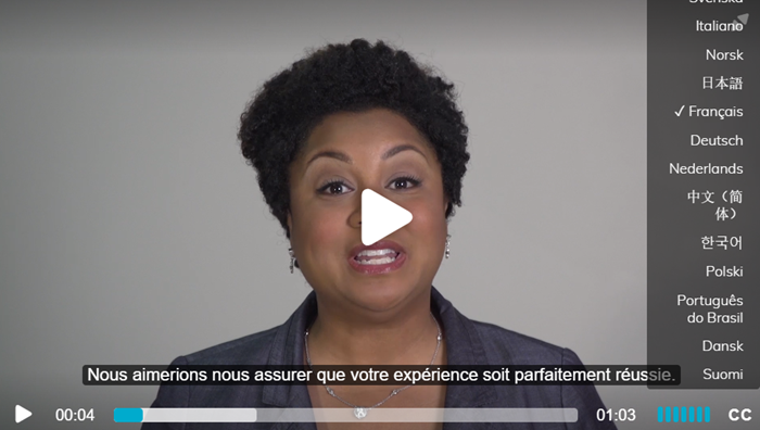Hirevue-offered videos are files that Hirevue creates and provides to clients for use in their video interviews. If a Hirevue-offered video has translated subtitles in a supported language, then a CC logo will appear in the lower right corner of the video. Users can click the logo to view a menu of supported languages, where they can choose the subtitles they want to use.