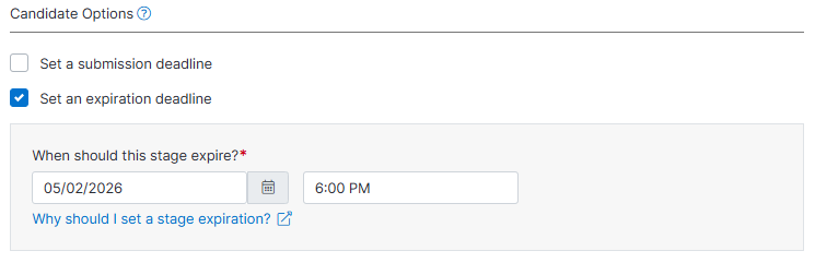 Use this when: An Expiration Date has been set for this Job Stage. The candidate hasn’t finished yet, but their link is about to expire (or already has). How it works: This change affects all incomplete interviews on this Job Stage. When you extend the expiration date for a stage, it affects everyone in that stage who hasn't submitted yet.