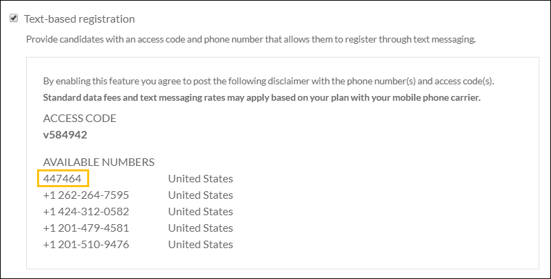 - Generate a phone number or short code along with an access code that candidates can use when self-registering via SMS (text) message.