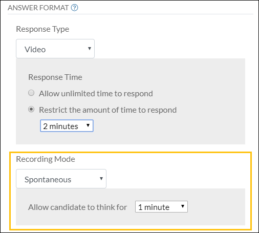 When you configure an answer type for an on-demand interview, you use Recording Mode to specify the time and retake limitations you want to apply to the answer. For example, when configuring a video answer, you can specify the time limit for candidates to respond, as well as the number of retakes they are allowed.