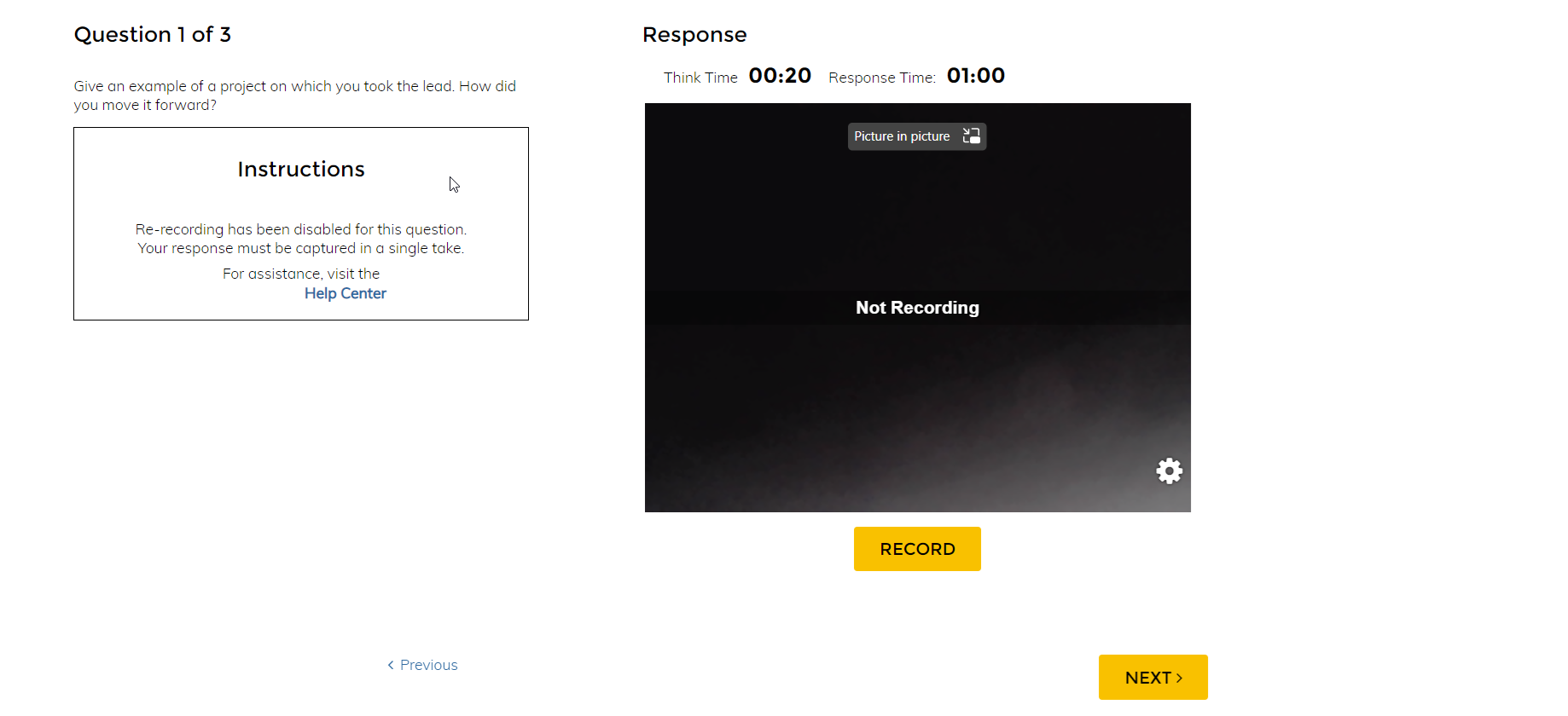 Below is an example of the candidate experience when you select the Single Take recording mode.