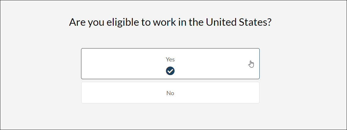 When candidates complete the interview, they can read the question, and then select Yes if they are eligible to work in the U.S., and No if they are not.