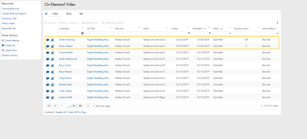 When all interviews are complete, you can open the on-demand video grid to review the candidate interviews. You can select the Question Score column to filter candidate responses by question score. The following image shows two of the four candidates responded Yes to the eligibility question, thereby earning them question scores of 100. You can easily select those two candidates to move to the next interview stage, and then decline the ineligible candidates.