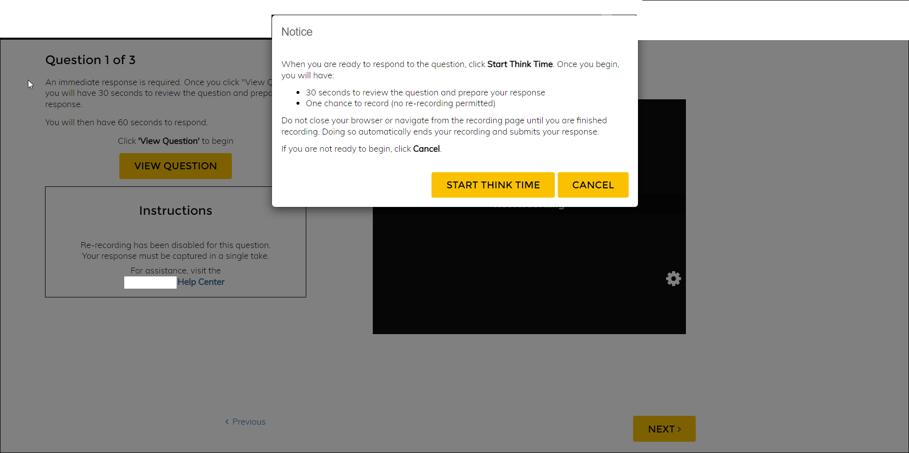 When candidates select View Question, a pop-up appears, telling them how to begin their Think Time, and once they do, how long it will last.
