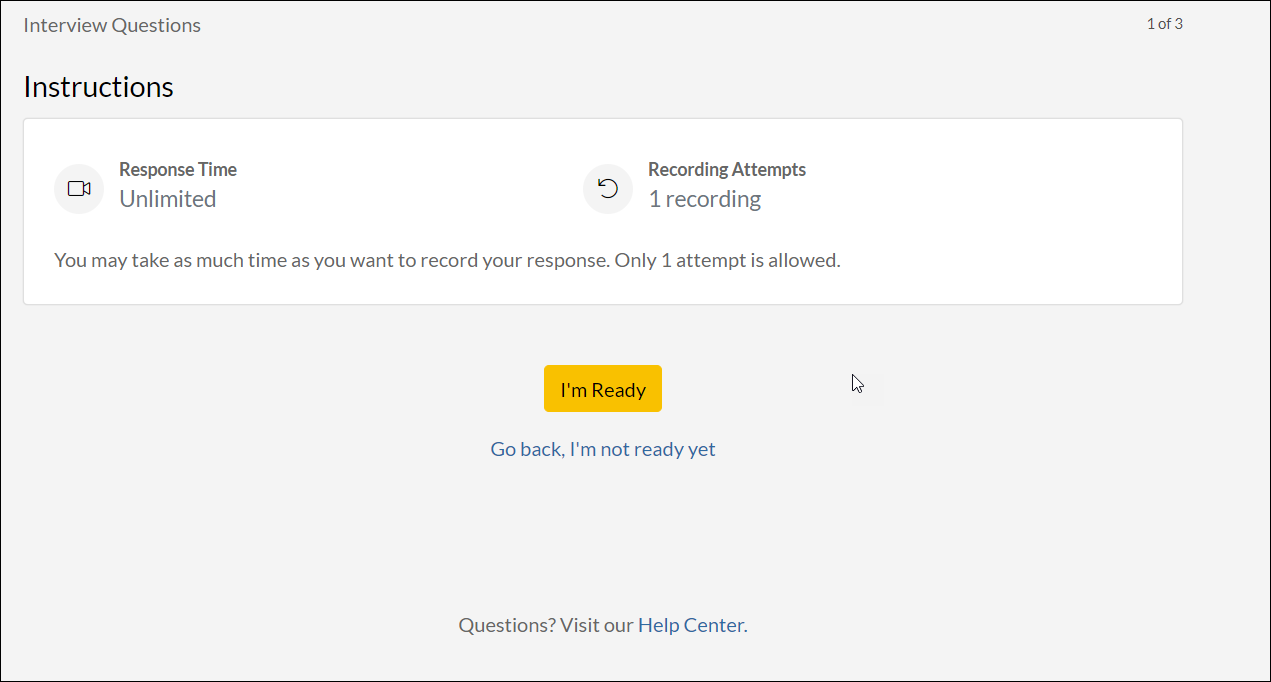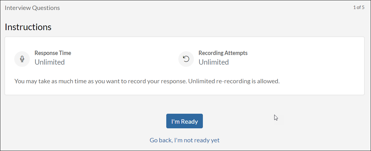 Unlimited Retakes mode permits candidates to re-record or re-enter their answer as many times as they like before submitting their interview.