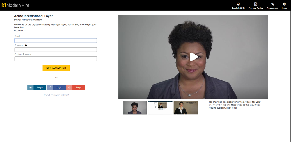 Lets candidates log in and out of their interview as required until they submit the interview. Candidates can either log in with their email and a password of their choosing, or with their LinkedIn, Facebook, or Google credentials.