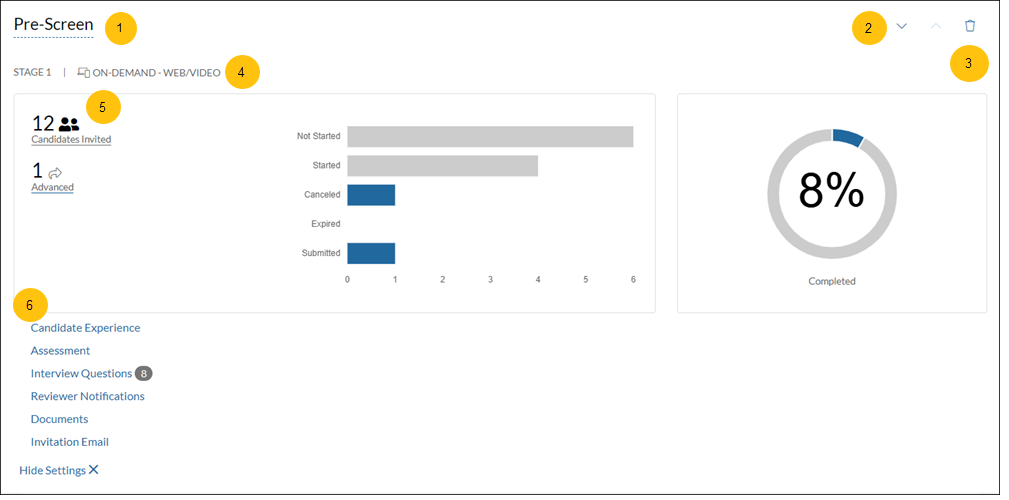 Collection of information and settings related to each interview stage in a job. Refer to the numbered links after the example below for more information about the interview stage card.