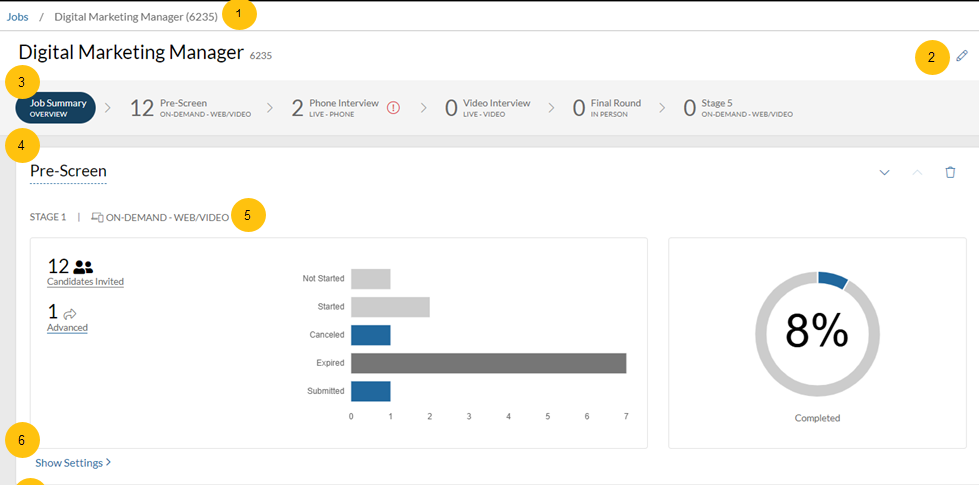 Visual indicator of the interview stages in the job and the number of candidates in each interview stage. The progress bar for each job includes an overview page that includes each interview stage card in the job, displayed in the order in which candidates will progress through them.