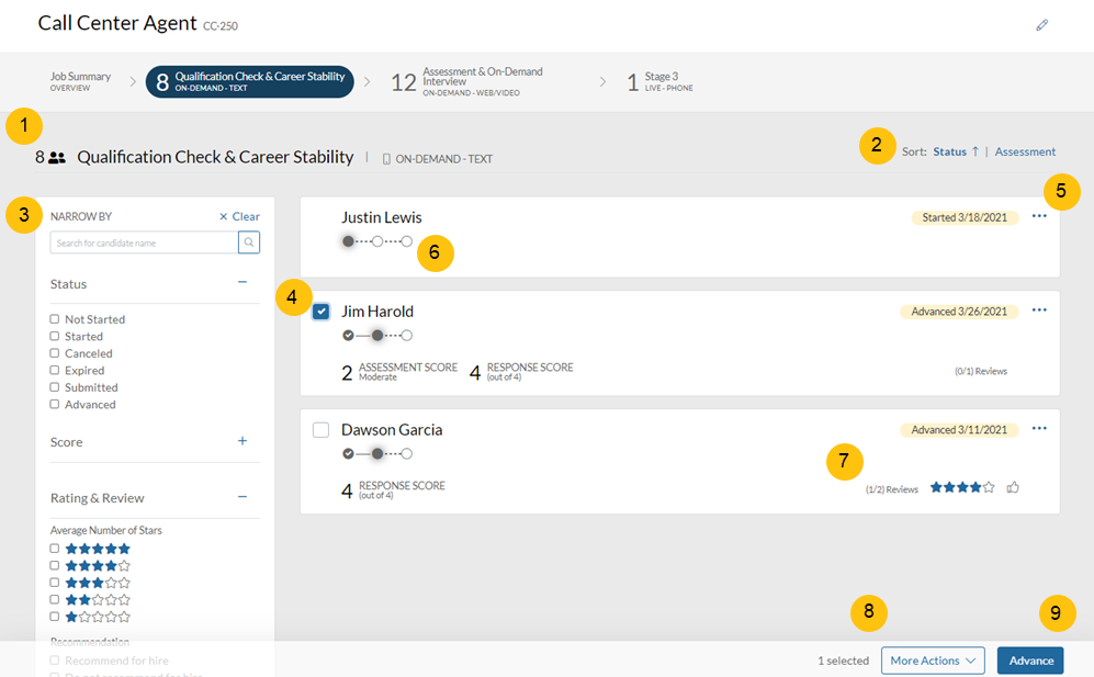 When you select one or more candidates using the bulk action selection check boxes (see 3- Bulk Action Selector), the Advance button appears, allowing you to move selected candidates to the next interview stage.