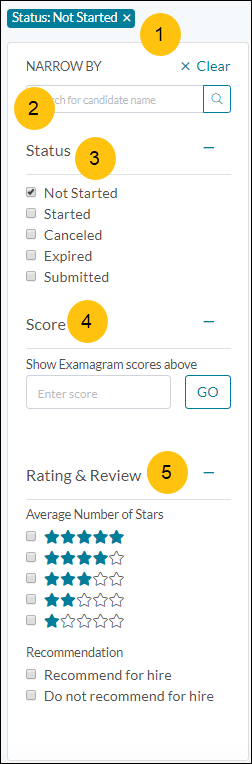 Lets you filter candidates who achieve a specific review or rating. You can choose to show candidates that earned a specific star rating, or that are recommended or not recommended for hire (thumbs up/thumbs down review). For more information, see Rating and review.