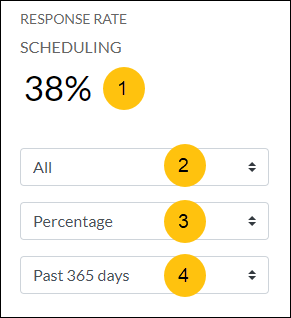 The Response Rate Scheduling tile displays the number or percentage of candidates that responded to your request to self-schedule live video, voice, or in person interviews within the date range specified in the tile.